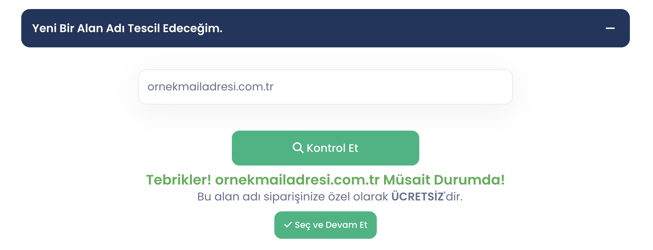 Eğer henüz bir alan adınız yoksa ve ilk kez kurumsal e-posta alacaksanız, “Yeni Bir Alan Adı Tescil Edeceğim” sekmesi üzerinden müsait alan adlarını kontrol edin.