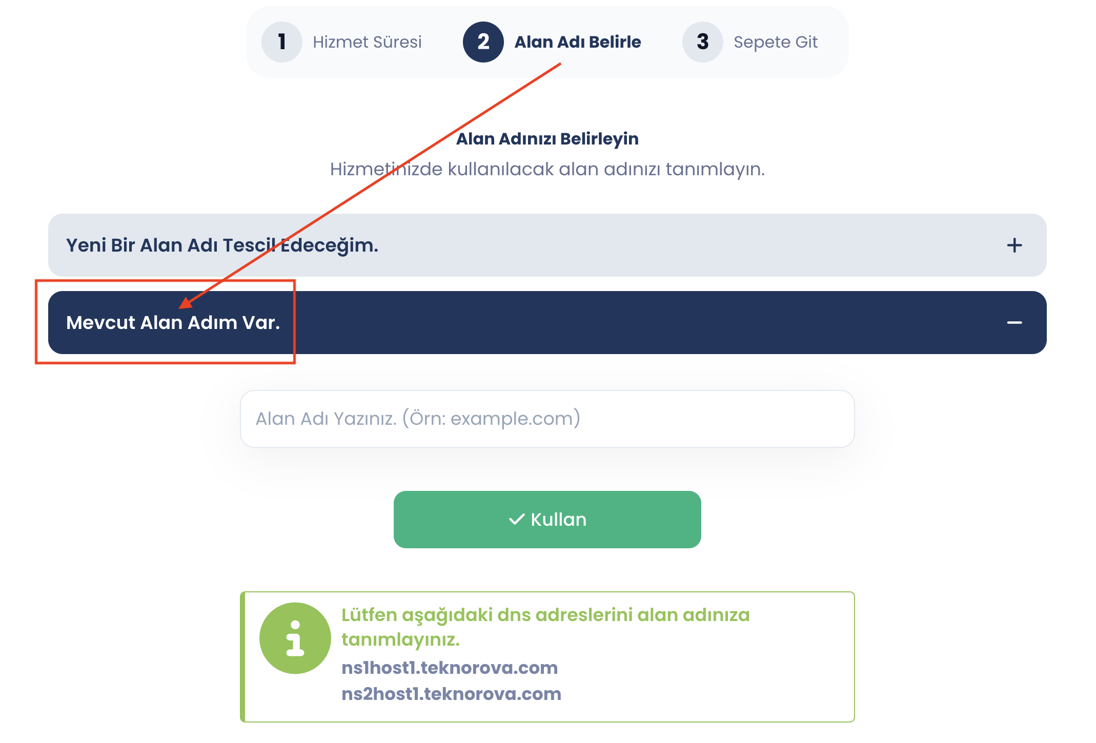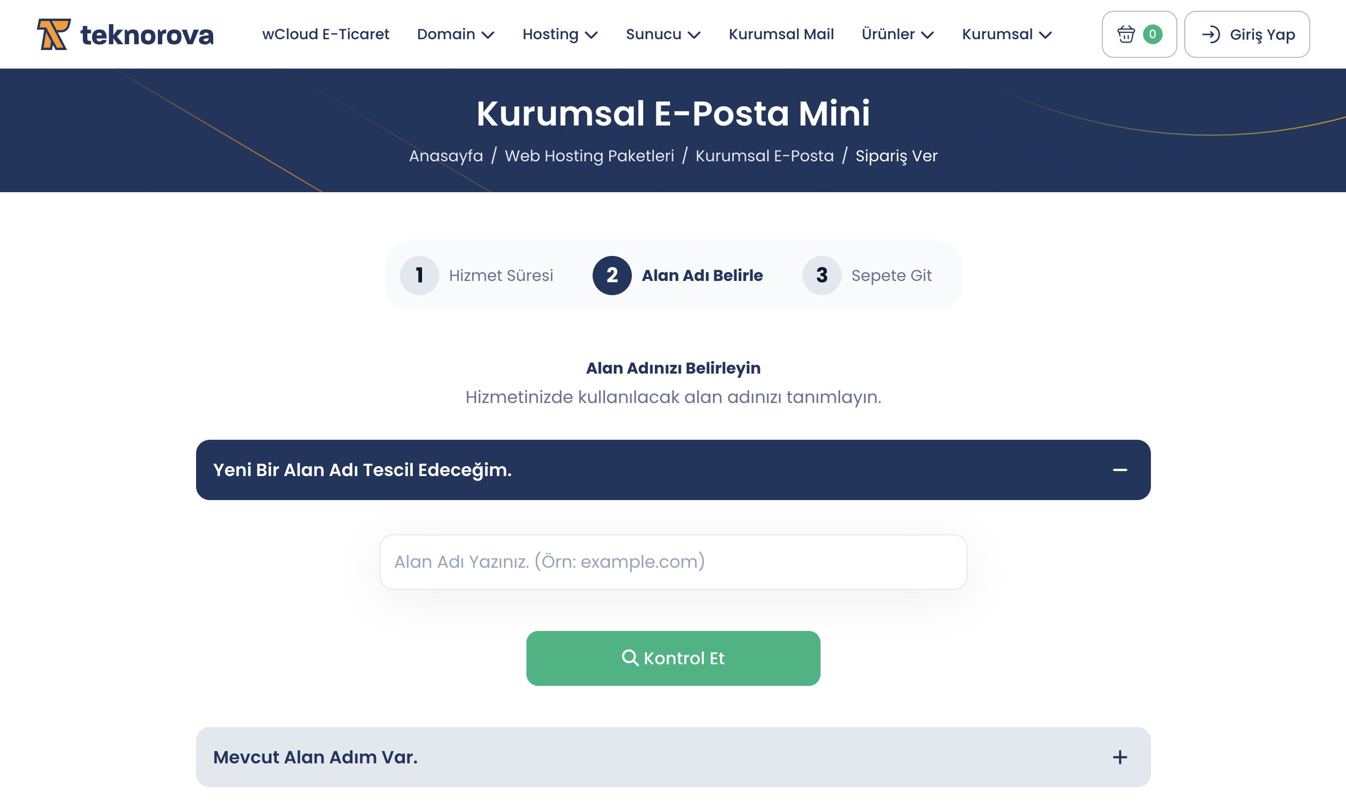 Önemli: Eğer daha önce aldığınız bir alan adınız varsa Mevcut Alan Adım Var seçeneğini seçmelisiniz. (Bu durumda sadece kurumsal mail paketinin ücretini ödersiniz)
