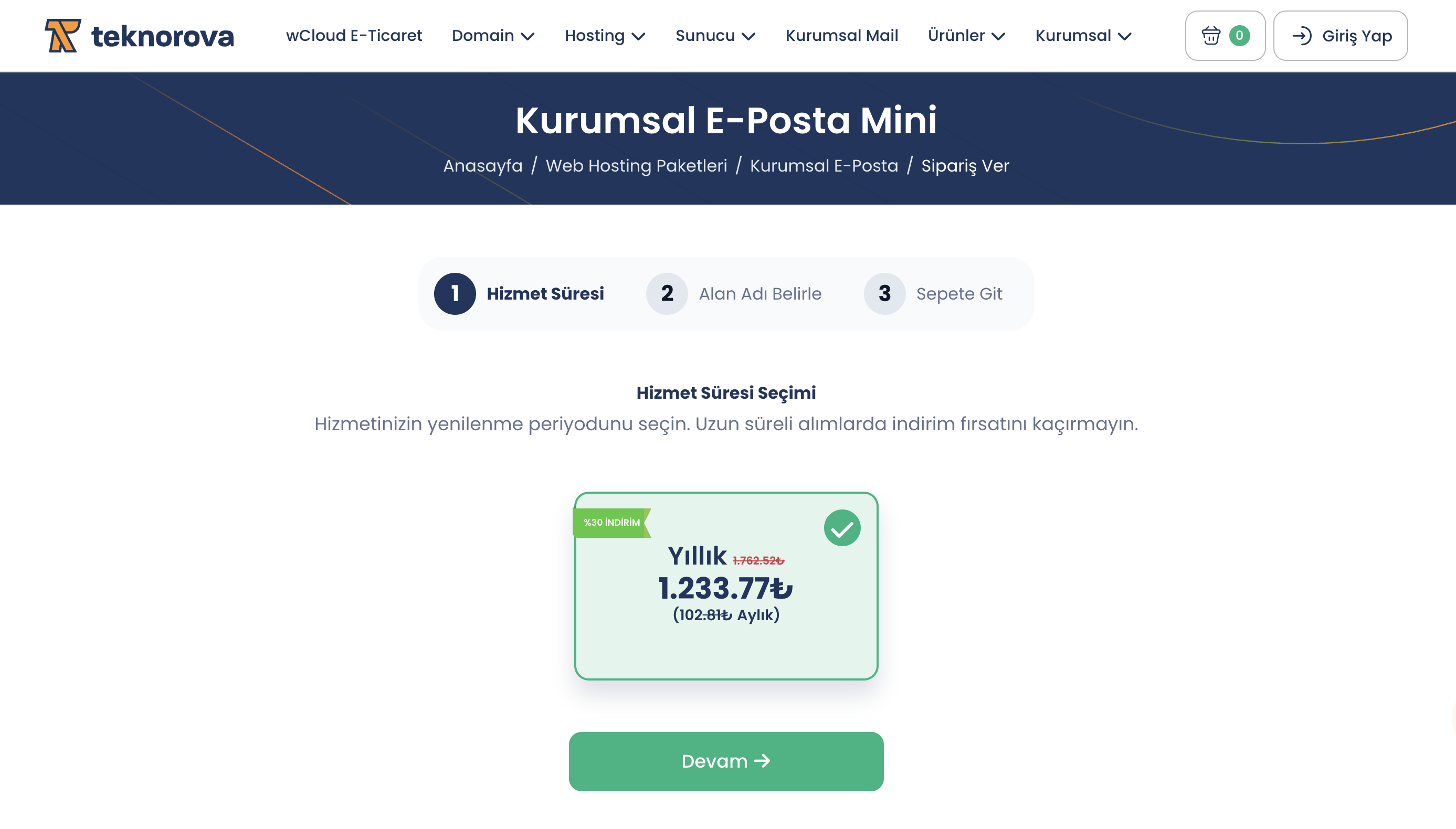 Alan adı ve Kurumsal E-Posta 2 ayrı ürün olarak sepetimizde görünüyor mu teyit ediyoruz. Her şey doğru görünüyorsa Devam diyerek ödeme adımını tamamlıyoruz.